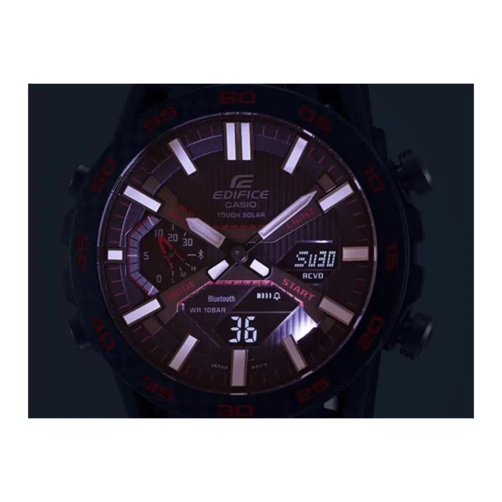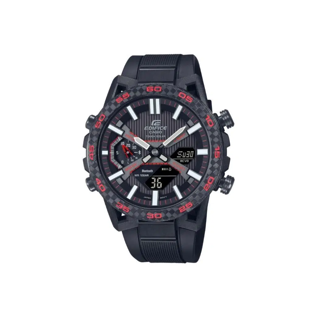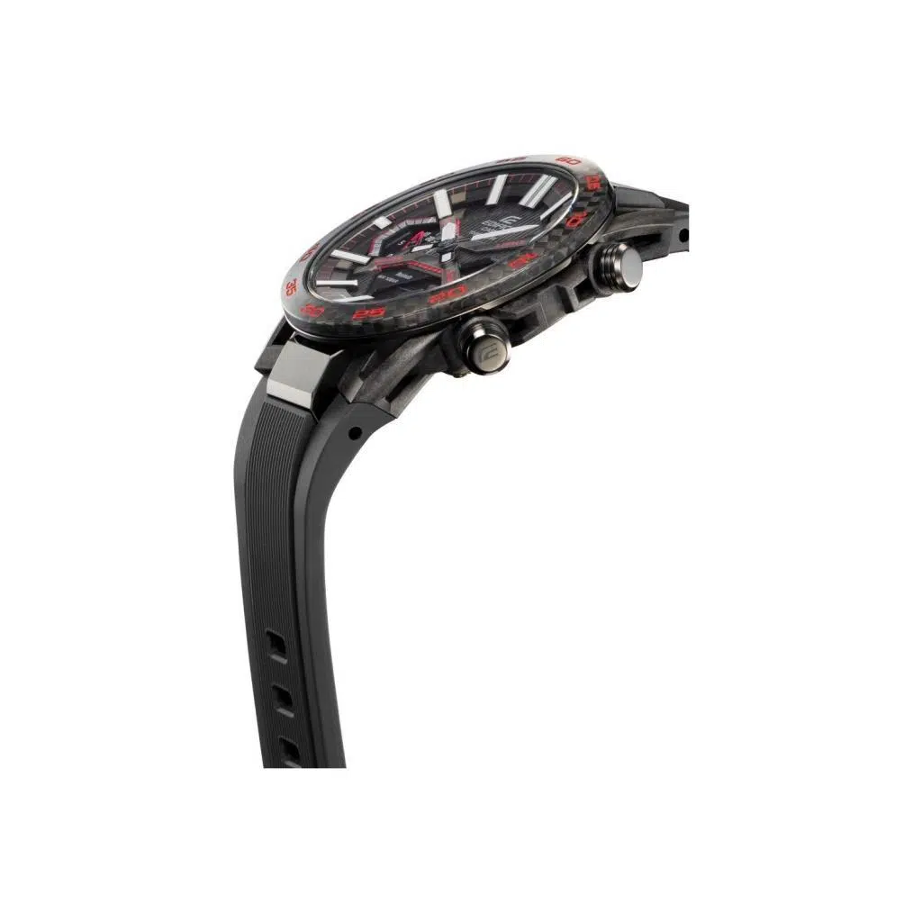 Formula yarış arabalarının süspansiyonundan ilham alan benzersiz bir gövde tasarımı. Yarış arabalarında kullanılan dört kollu süspansiyon gibi, iki kol yukarıda ve iki kol altta olmak üzere, tırnaklar da dört kollu bir düzende yapılandırılmıştır. EDIFICE serisi için bir ilk olarak, gövde için karbon fiber takviyeli silikon kullanılmıştır.